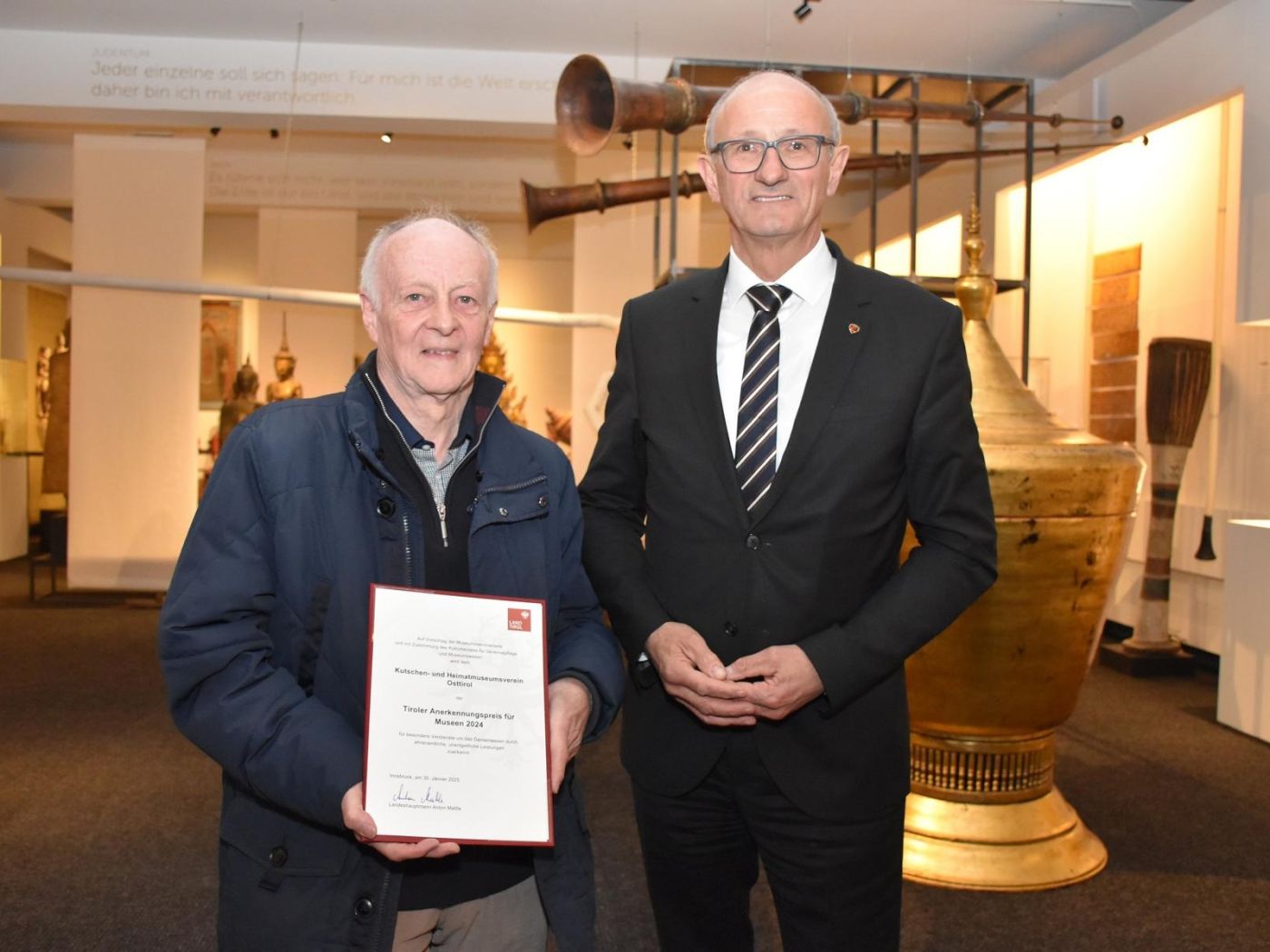Der Tiroler Museumspreis geht heuer an das Museum der Völker in Schwaz. Dieser ist mit 6000 Euro dotiert. Im Rahmen des Festakts im Museum der Völker überreichte Landeshauptmann Anton Mattle Donnerstagabend auch den Anerkennungspreis des Landes, der wurde heuer dem Kutschen- und Heimatmuseumsverein Osttirol zuerkannt und von Vereinsobmann Gernot Vinatzer entgegengenommen.