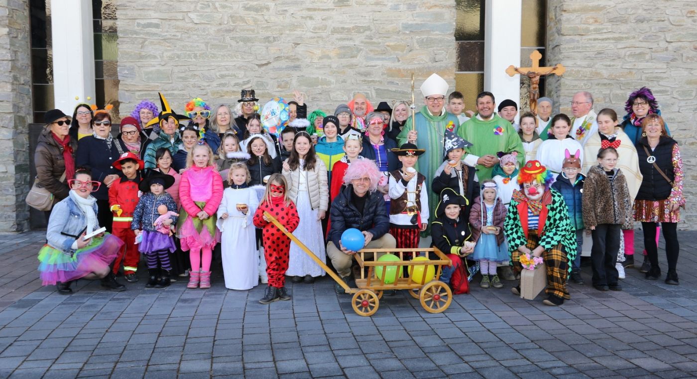 Bischof Hermann Glettler mit Diakon Michael Brugger, den "Kids im Süden der Stadt", Pfarrgemeinderat und allen, die den bunten Faschings-Gottesdienst mitgestaltet haben. Foto: Pfarre Hl. Familie