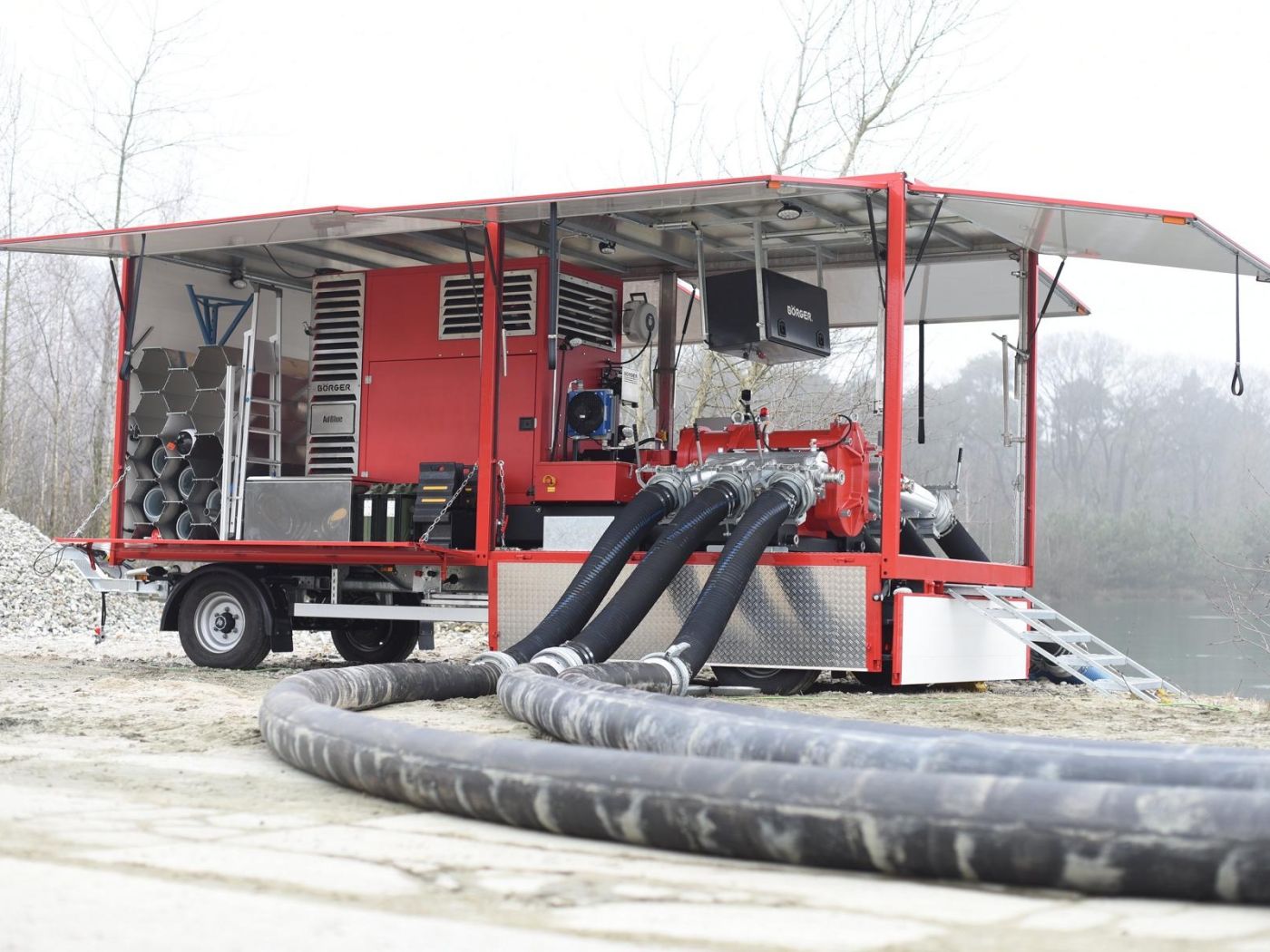 Die Hochleistungspumpe ist auf einem 8,3 Meter langem Anhänger montiert und kann damit schnell zu Einsatzorten transportiert werden. Sie verfügt zudem über insgesamt 300 Meter Schlauch. Damit kann sie auch in schwerer zugänglichen Gebieten eingesetzt werden. Foto: Börger GmbH