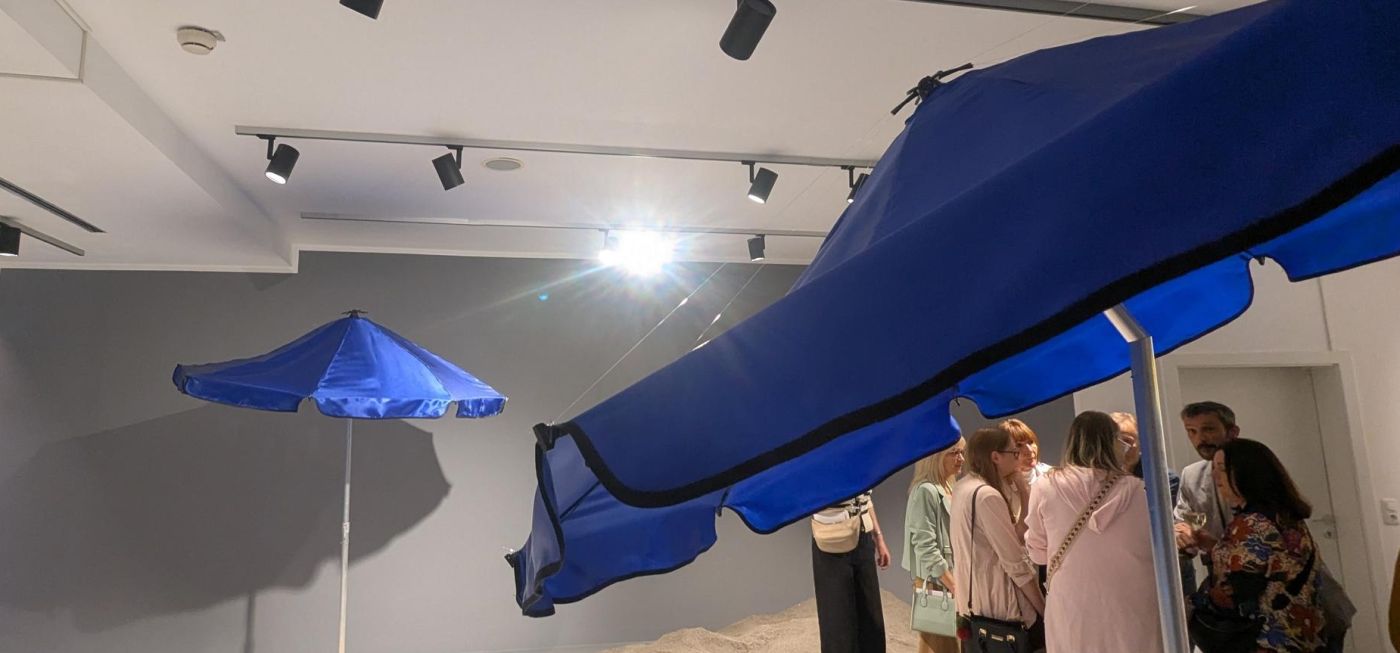 Im Zentrum steht eine raumgreifende Installation, bei der aktuelle Börsendaten in Bewegungen übersetzt werden. Diese bringen Sonnenschirme zum Schwingen – ein symbolträchtiges Bild für die globalen Zusammenhänge von Kapital, Klima und Konsum.