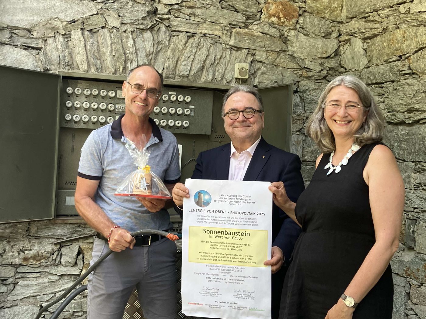 Mit dem Verkauf von symbolischen „Sonnen-Bausteinen“ und Spenden konnte die evangelische Pfarrgemeinde Lienz die Errichtung der PV-Anlage finanzieren, freute sich Pfarrerin Margit Leuthold. Die fachliche Begleitung durch Projektleiter und Nachhaltigkeitsberater Gerald Altenweisl wurde über die Tiroler Wirtschaftsberatungsförderung unterstützt.