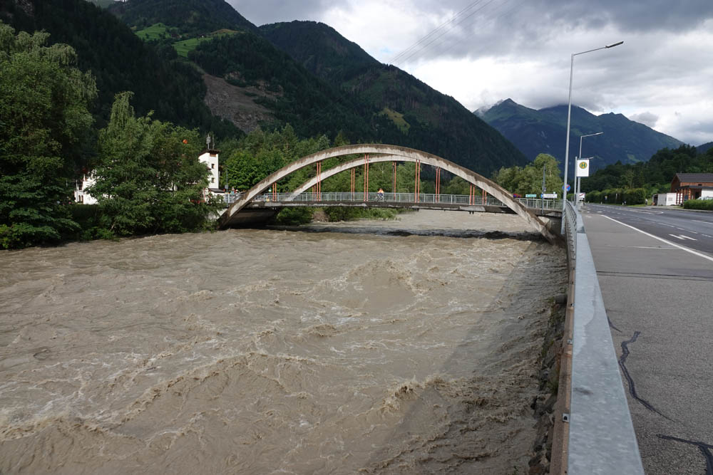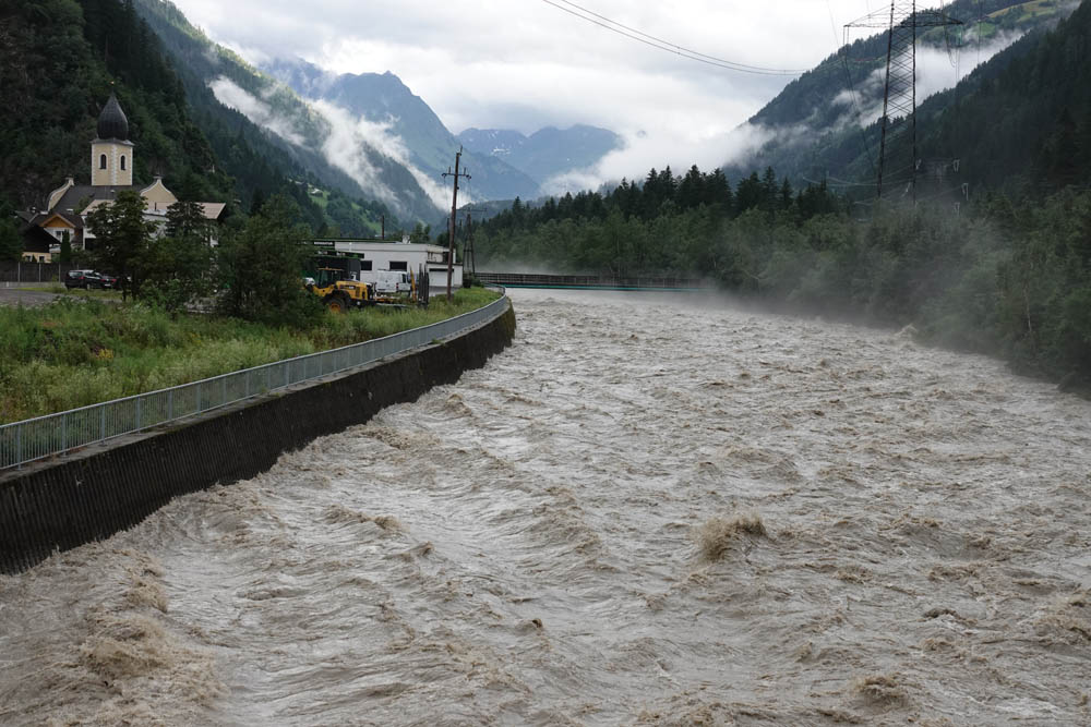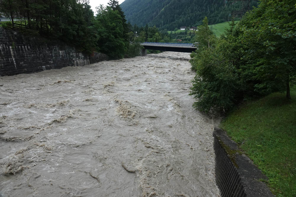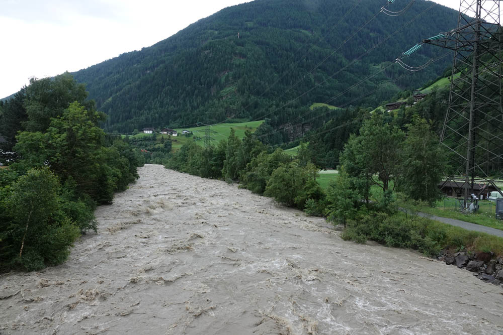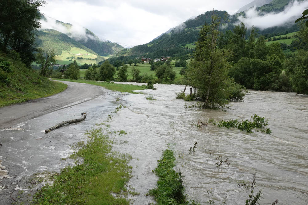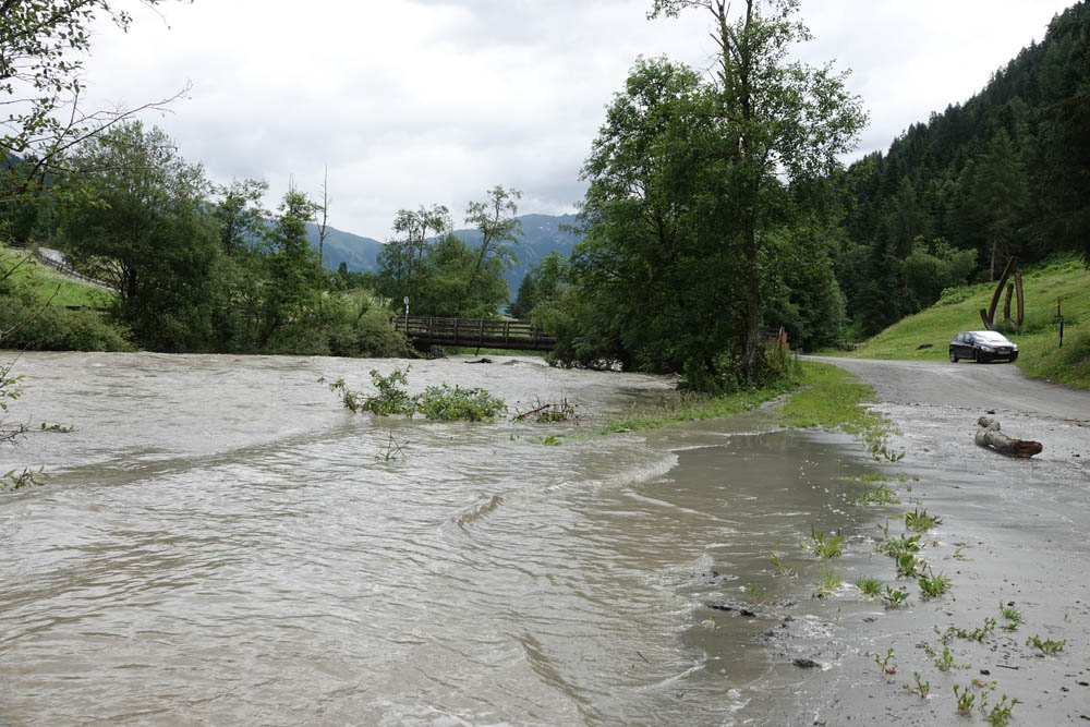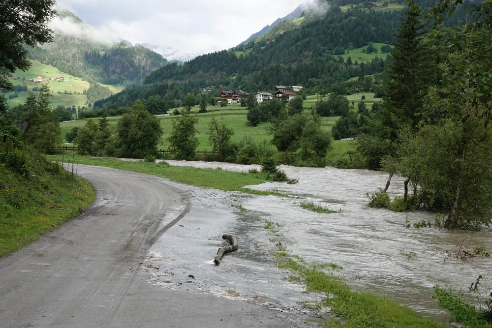 In Folge der starken Niederschläge, die seit Samstagnachmittag über dem Tauernhauptkamm niedergegangen waren, kam es auf Osttiroler Seite zu Überflutungen. Betroffen unter anderem das Gschlösstal oder die B 108 Felbertauernstraße in Matrei, die auch unterspült und beschädigt wurde.