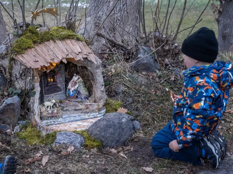 Ein Wurzelstock am Radweg zwischen Lienz und Nussdorf-Debant wurde zur Bühne für ein besonderes Projekt: Krippenbauer verwandelten die Naturform in eine Weihnachtskrippe.